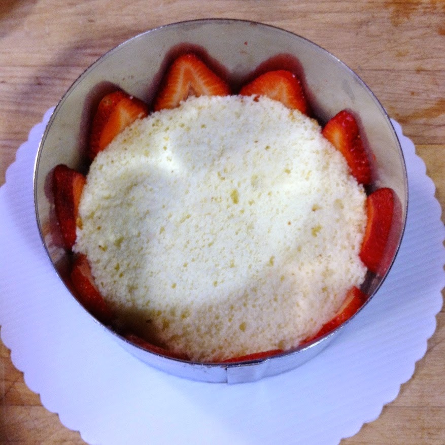 We didn’t use an outer layer of sponge this time. Instead, we lined the outside with strawberries.