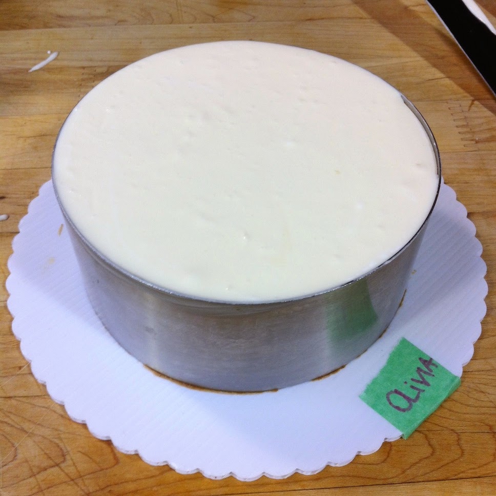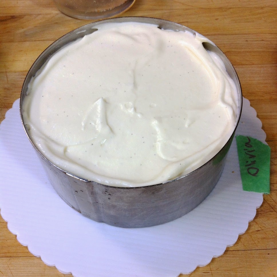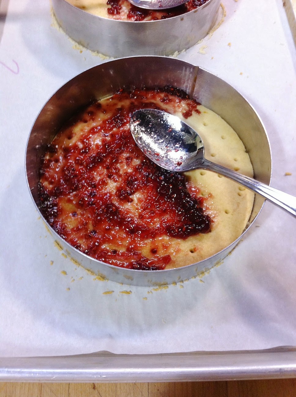 Then we started the Raspberry Fromage entremet, which has a raspberry sponge layer and a cream cheese layer. This one had a crisp tart crust on the bottom.