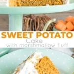 This Sweet Potato Cake is moist and delicious. The cake itself has a comforting Fall spice flavor, reminiscent of pumpkin, but not quite. The cake is not super sweet, so it pairs really well with the sweet but light as air marshmallow frosting.