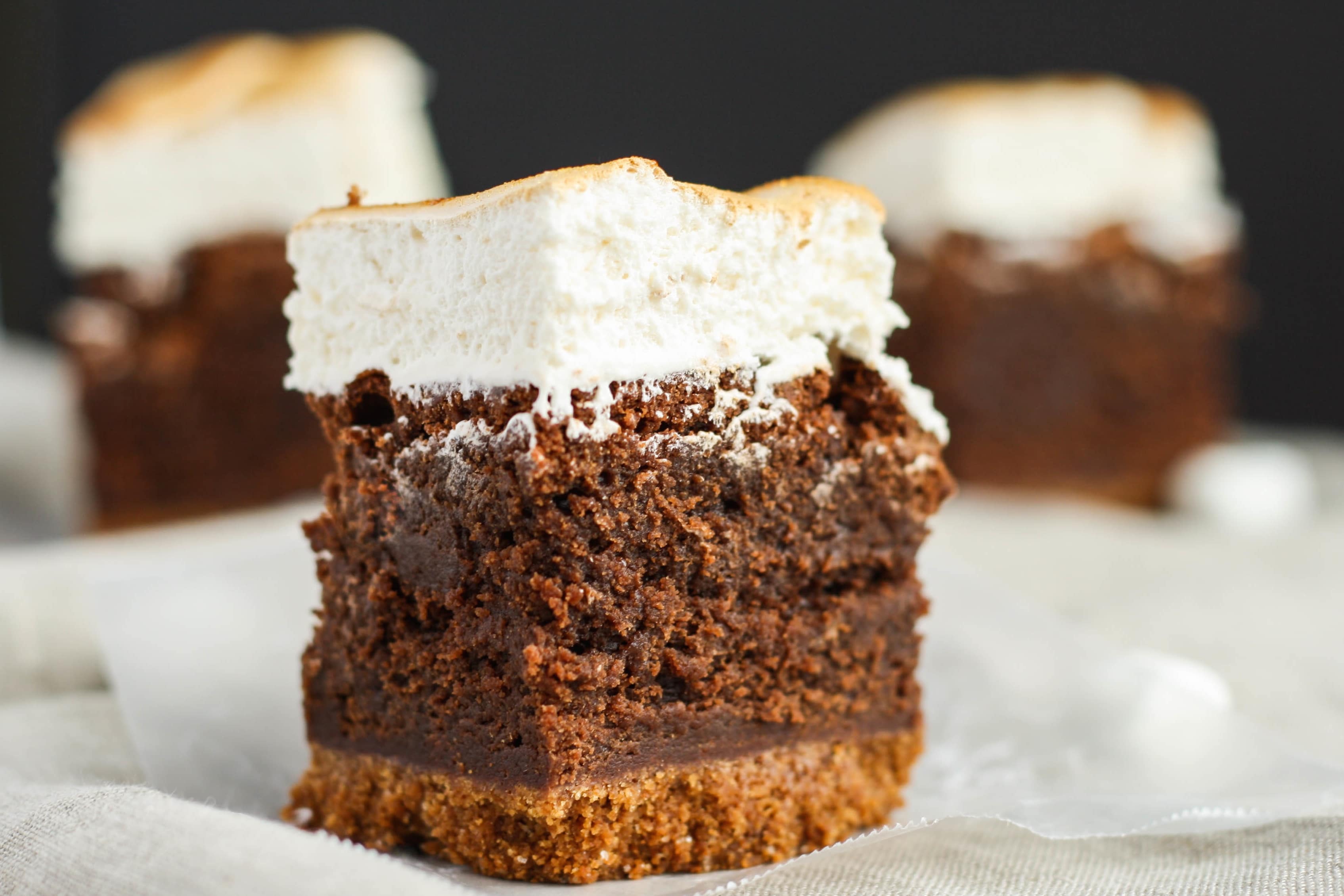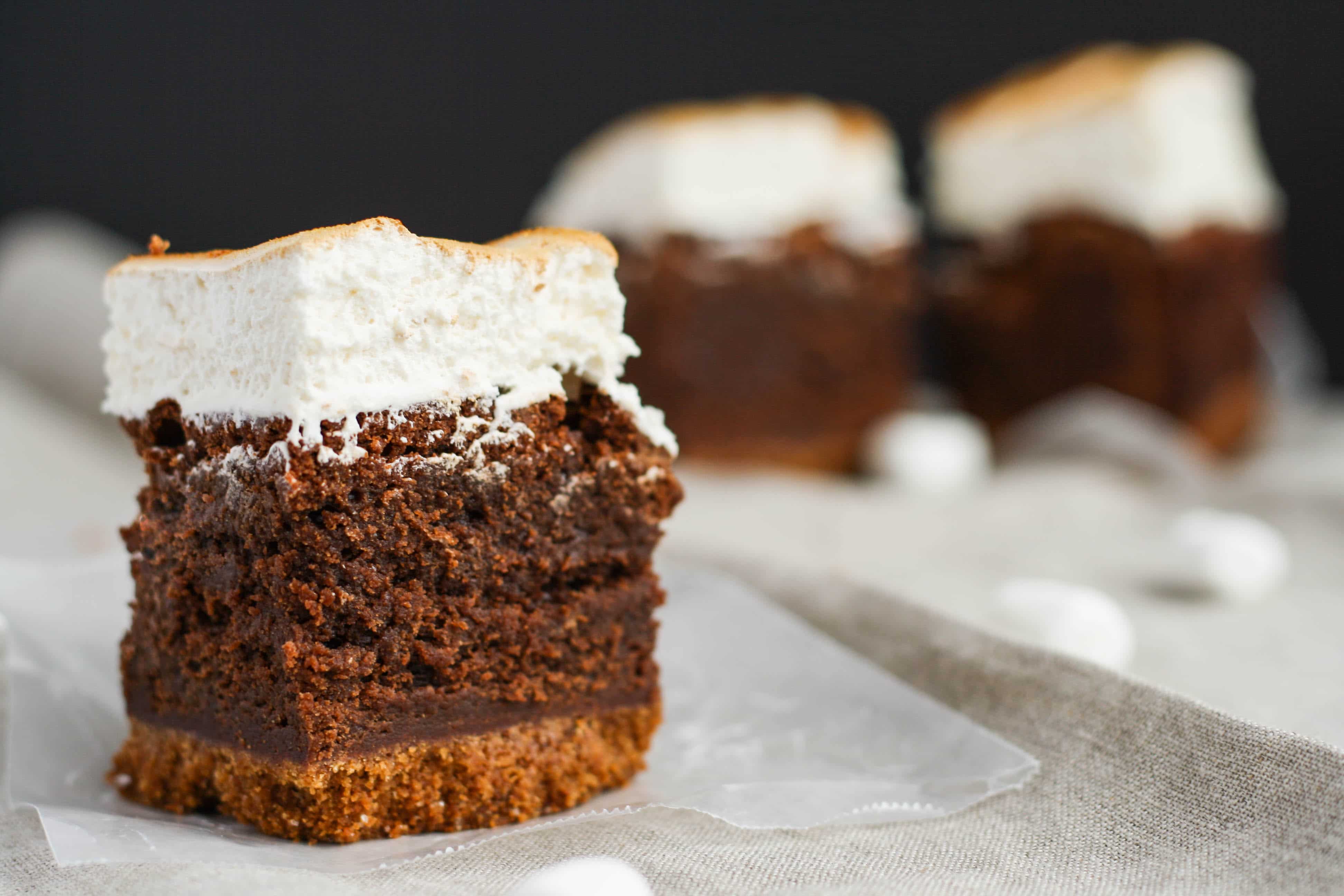 A rich chocolate brownie, graham cracker crust, and gooey toasted marshmallow… these s’mores brownies are even better than the real thing!