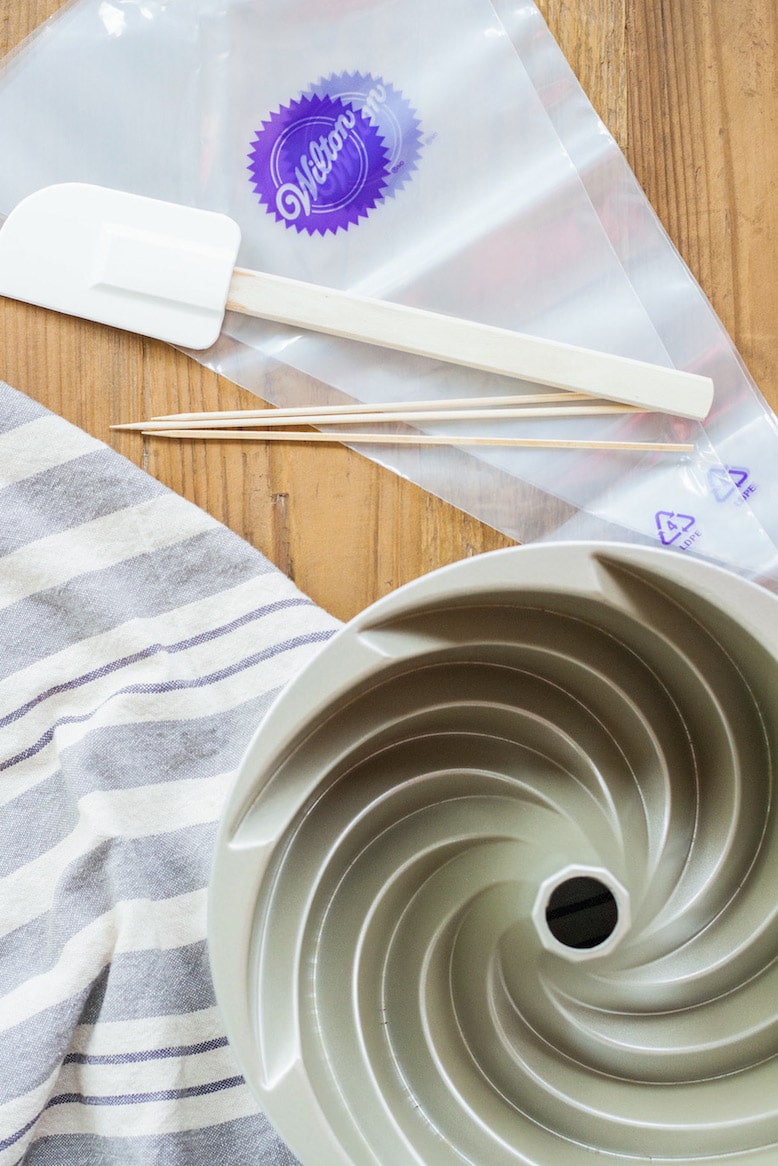 For this tutorial you’re going need a bundt pan (obviously), enough pastry bags for each color you do, enough cake skewers for each color (or something equivalent), and a spatula.